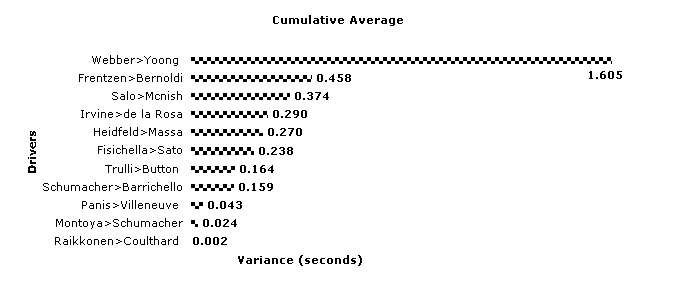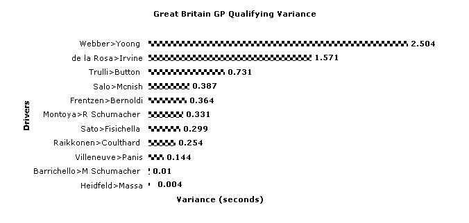 I thought Ferrari would win today, I thought wrong. Four in a row for Montoya. He is quick, and today he was lucky. Schumacher came within a whisker but failed in sector two on his last lap. That is not to take anything away from the new premier pilot. To get one pole is a great achievement, to get four on the trot against the Ferrari's is fantastic. Cooky asked for whom the bell tolls, it tolls for Ralf. Conservatism is dead, Ralf may have the points but perseverance is not enough and Ralf only perseveres. One third of a second is a long time in F1 and that was as close as Ralf could manage. Of the others, Schumacher (the good one) was not disgraced being only 100th behind a motivated Barrichello, Coulthard couldn't match the flying Finn and Trulli and Sato excelled. Button was unlucky to have an engine fail on his first run, as was Fisichella. The British GP 'Also Ran' Award. de la Rosa just managed to qualify but he spent almost the entire session having a water leak repaired. Yoong failed to qualify and doesn't deserve a seat in the stands tomorrow, let alone a pit pass. While Ralf would have been a worthy recipient, yet again, and Fisichella is running backwards very quickly, being 0.3 behind Sato, Alex showed that he is (fortunately) in a league of his own. Alex, be thankful you now have another Also Ran, they are the only F1 accolades you will ever earn. The British GP Qualifying Heroes 1. Mark Webber, 2. Eddie Irvine, 3. Jarno Trulli Want to send a comment to the Quali-flyer ? Click here