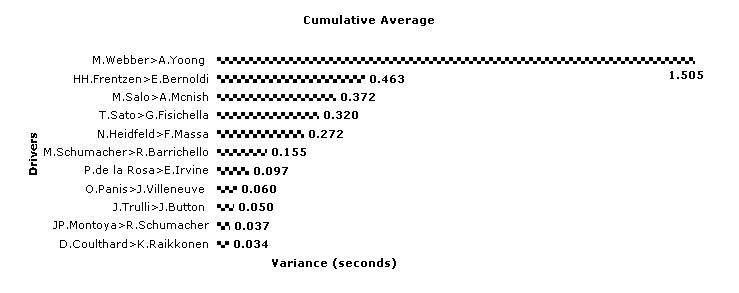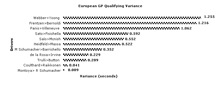 What is the definition of mixed emotions? The standard answer is watching your mother-in-law drive off a cliff in your new Porsche. Today I had mixed emotions watching Montoya blow my predictions away on his way to his 3rd Pole in a row. While I still maintain that the Ferrari is the better car it is very good for F1 to see the cracks appearing in the invincible Schumacher/Ferrari package. Michael may have got there if he hadn't made a mistake on the last corner of his last run but he got the spot he deserved. The fact that he only failed so as to make our esteemed editor's prediction come true is immaterial. While taking nothing away from the performance of the Williams duo, today was another victory for Michelin. You have to look back to 9th place to find the first of their 'other' teams. Michelin are definitely getting the upper hand on Bridgestone. Looking at the results makes it glaringly obvious how little the driver contributes to today's F1 results. Williams, Williams, Ferrari, Ferrari, McLaren, McLaren, Renault, Renault. On this track, on this day, this is the way the cars stack up and the best driver on the day can only manage to outperform his team mate. Even down the back, Alex Yoong can get his Minardi within one and a half seconds of someone who can drive a race car. Tomorrow luck, strategy, team orders and traffic will come into play, today the tyres and the cars determined the outcome. Webber and Salo still sit at the top of the Qualifying Table having now gone to 9-0, with Frentzen alone on 8-1. Fisichella, Heidfeld and Schumacher (senior) are all 7-2 up and Trulli is 6-3 to Button. The rest are in the undecided category with Montoya making a late surge for supremacy, and a very effective surge it is too The European GP 'Also Ran' Award. Jacques Villeneuve said yesterday "It's hard to say where we are at the moment but I guess we're expecting a similar qualifying performance to Montreal." Sorry Jacques, in Canada you had a go. In Europe, well, in Europe you didn't! Perhaps it was the lack of a home crowd, perhaps it was a hard night last night, perhaps you are just getting past it. Panis is a reasonable middle of the road pilot Jacques, not an ex World Champion with an ego that exceeds his talent. It must be rather galling to have him come home a second in front of you. At least you get the consolation of having won yet another Also Ran for your effort The European GP Qualifying Heroes 1. Mark Webber, 2. Heinz Harald Frentzen, 3. Olivier Panis Want to send a comment to the Quali-flyer ? Click here