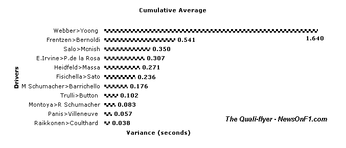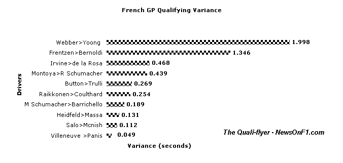 having driving lessons? It's a damn shame that the Arrows drivers and the team are being stuffed around the way they are. None of them deserve the situation they are in and irrespective of the cause, Tom Walkinshaw must either fix the problem or pull the team. Today was a clear and crushing victory for Michelin. Seven of the top ten cars were on Michelin tyres with Heidfeld in 10th being the best of the non-red cars using the made-for-Ferrari Bridgestones. The French GP 'Also Ran' Award. So many duds, so few trophies. Where does one start? Ralf, we knew that he would be found wanting when the pressure was on, and he proved that again. David must be getting used to being outshone by flying Finn's, or perhaps he just can't do anything about it. Jarno proved yet again that he can't decide whether he is on the way up or down. Pedro was a long way down on Eddie but having only completed 2 runs (versus Eddie's 4) I have to give him the benefit of the doubt. Not so Alex, he was just bad. No, David's performance earned him nothing more than an honourable mention, Ralf and Alex have to fight it out for top honours so, in the closest battle to date, our Also Ran for France goes to the man who least lives up to the high standards set by his brother, our first three times winner, Ralf Schumacher and Alex can rest easy knowing that he is guaranteed to win more also rans before fading away into obscurity as one of F1's least best driver ever when Daddy's cash runs out. The French GP Qualifying Heroes 1. Mark Webber, 2. Eddie Irvine, 3. Juan Pablo Montoya Want to send a comment to the Quali-flyer ? Click here