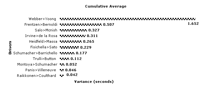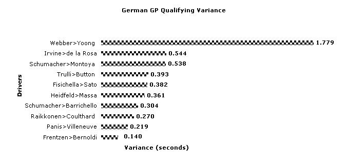 Gee, I was right! But I was also wrong. Hockenheim made some reputations and wrecked some. With no less than seven different vehicles in the top ten the driver element really played a part in today's event. Michael proved yet again that he is a master at learning a new track. Ralf, Who was hopelessly outclassed by Button when a new layout figured in the equation at Indy, performed superbly in taking second, over ½ a second ahead of Juan Pablo. As expected there was a stratification of players, with some surprises and a few anticipated results. Michael and Kimi performed as expected, as did Fisichella Frentzen, Irvine and Webber. The surprises were Montoya, Massa, Salo and Button. I guess I have to be satisfied with picking the first (Schumacher) and last (Webber – I did suggest that Alex would fail to qualify). Mark is now the only driver with a perfect win rate, having taken his 12th Qualifying Hero podium. I had high hopes for Salo here, he didn’t deliver, I had no faith in Panis and he did come through, like Ralf. The German GP 'Also Ran' Award. Alex Yoong failed to qualify (yet again) and must be a huge embarrassment to the team and the sponsors. I guess he can at least tell his grandchildren that he was once a F1 driver and spent most of a season doing it. He might just forget to mention just how bad he was. But he wasn’t quite bad enough to win another Also Ran at Hockenheim. Coulthard and Villeneuve weren’t bad enough either, close, but no gongs for them this time. Only because there is a much worthier candidate this round. If Michael came in over ½ a second behind Rubens he would be a shoe-in. Why should our ex-Qualipoints leader be treated any differently. He shouldn’t and he won’t be. After a string of successes on one podium Juan Pablo Montoya has moved to another, the middle step on the Also Ran stage. Perhaps he was just jealous of Ralf’s success in this forum The German GP Qualifying Heroes 1. Mark Webber, 2. Eddie Irvine, 3. Ralf Schumacher Want to send a comment to the Quali-flyer ? Click here