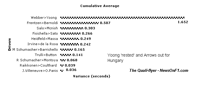 Montoya to be competing in a different race! Michael got beaten, the McLarens got lost. Bridgestone won the day and the McLarens couldn't stay with the Saubers. The Renaults also got the better of them and 10th and 11th was where they belonged. There were some surprises, notably the Saubers and McLarens. Not having the Arrows cars there was not surprising, seeing 2 Minardis 0.6 seconds apart was. Anthony Davidson is very, very good. To lose your first real race to Mark Webber by only a half a second is an achievement. To do it in a strange car is fantastic. The Saubers split Trulli and Button and Fisichella excelled. For the rest of the pack there was clear stratification. Ferraris, Williams, Saubers, McLarens, BAR's, Jaguars, Toyotas and Minardis all side by side. As in Europe, the cars (and Fisichella's talent) determined the result. Mark Webber remains as the sole keeper of a perfect 13-0 score, with Salo on 12-1, Frentzen on 11-1 and Heidfeld and Fisichella on 10 apiece. Michael and Jarno are the only other drivers to have asserted any real authority with their 9 wins to date. The Hungarian GP 'Also Ran' Award. Not much to think about really, for the second time in a row our Almost Champion wins an Also Ran. Juan Pablo Montoya has dropped the ball and Ralf seems to have picked it up. I spent the first half of the season criticising Ralf. Guess I have to level the playing field. In the absence of a Malaysian contender the Columbian wins by a second. For someone with so much promise Juan sure can be bad when he tries (or doesn't). The Hungarian GP Qualifying Heroes 1. Ralf Schumacher, 2. Giancarlo Fisichella, 3. Pedro de la Rosa Want to send a comment to the Quali-flyer ? Click here