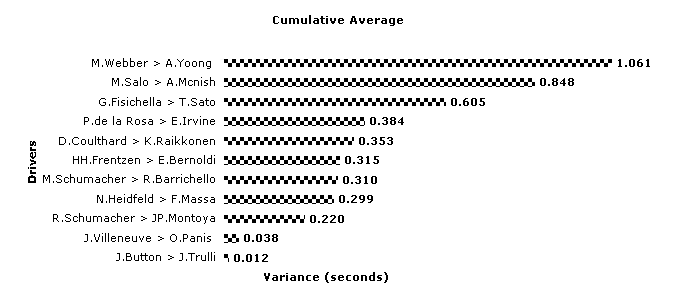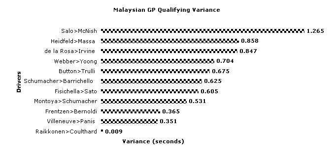 Comparing qualifying results from Melbourne to Sepang showed 7 of the 11 teams reverse their driver's relative grid positions. Who are the Alpha Males in the pack? M Schumacher (despite Melbourne), that's a given. Analysis of the comparative gaps in qualifying over the first two rounds shows an interesting situation. Those players that, at first thought, are the team leaders haven't delivered the goods. Fisichella has convincingly out qualified Sato. Salo has beaten McNish. No other lead driver has asserted any real dominance over his team mate. Trulli, a brilliant qualifier, holds an average advantage of just 100th of a second over Button. Only three drivers achieved an average advantage over their second driver of more than 0.4 seconds. Fisichella (even discounting Sato's Melbourne time) and Salo have asserted themselves. Coulthard has been given the wake-up call by the junior burger Flying Finn (mark II), he better answer it pretty quickly if he doesn't want to become the near-rookies number two. Discounting the Sato Melbourne result the greatest differential between drivers comes not at the front or middle of the pack, but at the tail end. The most significant qualifying performer this year has been Mark Webber! Where both drivers have qualified within the 107% range only Webber has averaged more than 1 second advantage over his team mate. Given the hype of the Frentzen's and Heidfeld's etc, both quality drivers not withstanding, it is a little surprising that they have been unable to convincingly outpace their less experienced partners. And the Also Ran award goes to: Eddie Irvine Your a legend in your own mind, you are the PR king of the circus, damn shame your cars so slow. Its also a shame that your opponent just shuts up and gets the job done with what he has. Ahh well, what's 0.85 seconds between team mates. Introducing Eddie Irvine, Malaysian GP 'Also Ran' winner. The Malaysian GP Qualifying Heroes 1. Mika Salo, 2. Nick Heidfeld, 3. Pedro de la Rosa Want to send a comment to the Quali-flyer ? Click here